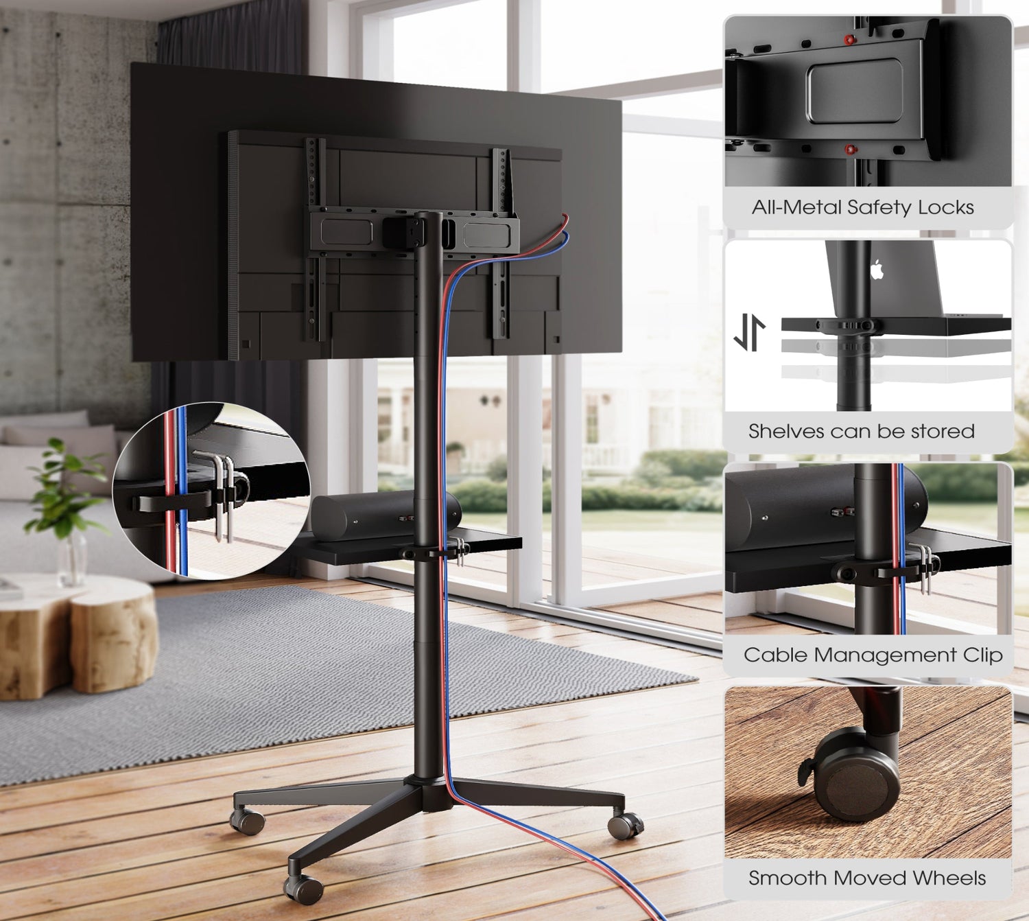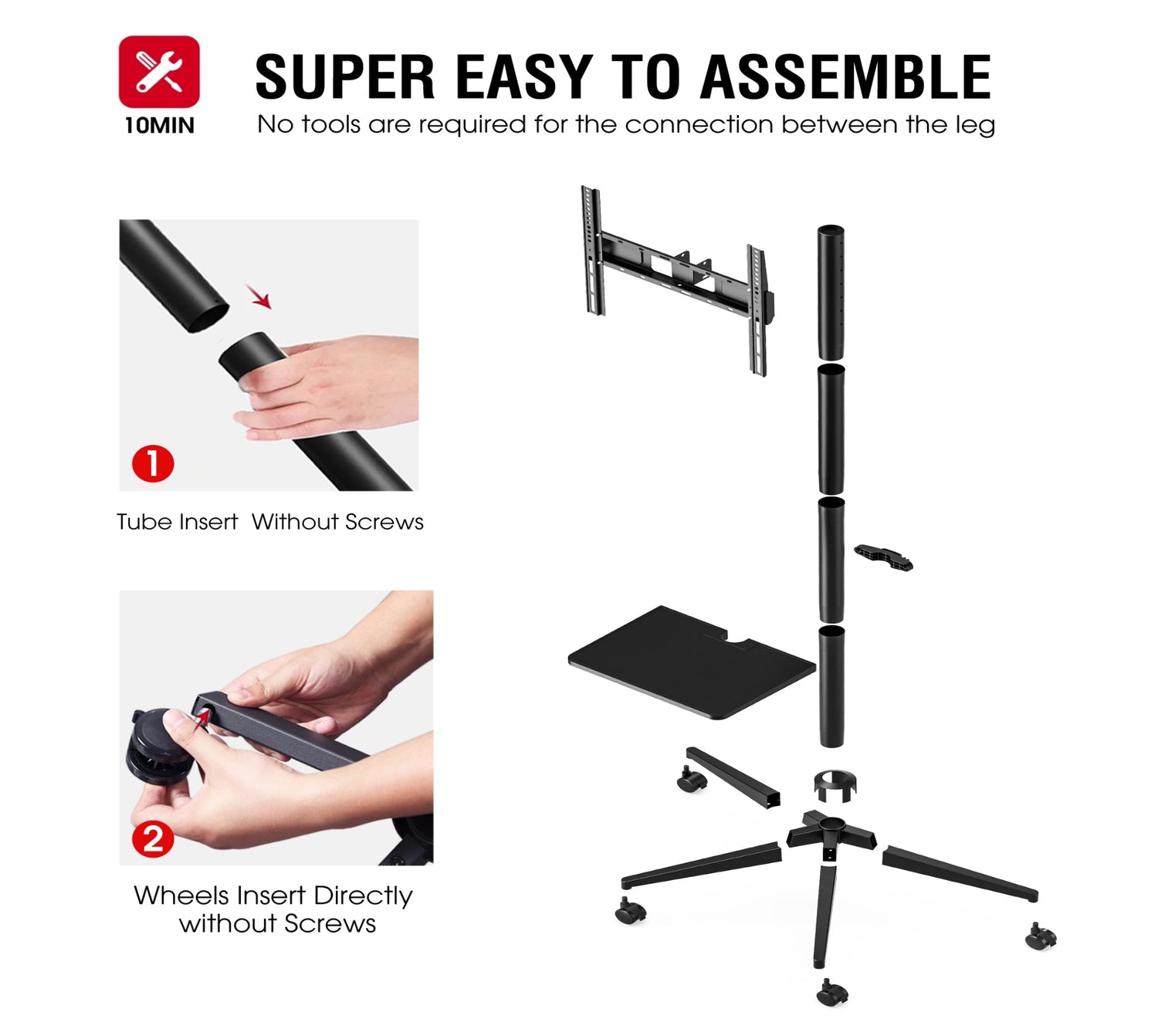 In order to solve the common problem of difficult installation, we have developed this super easy to install rolling TV stand, you do not need to face a bunch of different models of accessories, referring to our detailed installation instructions, just a few simple screws can be quickly completed in 10 minutes.