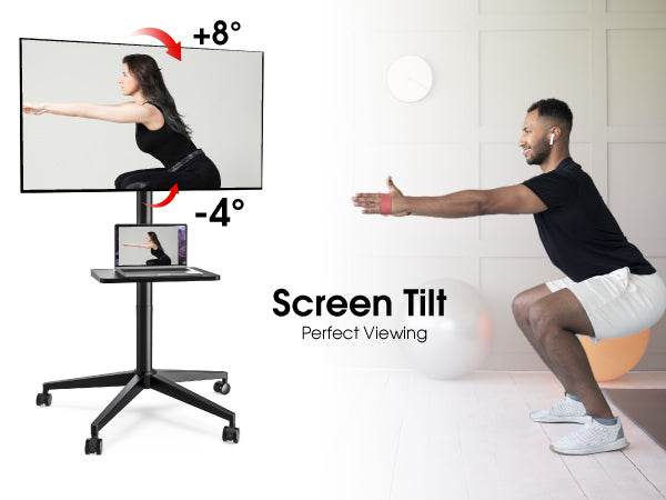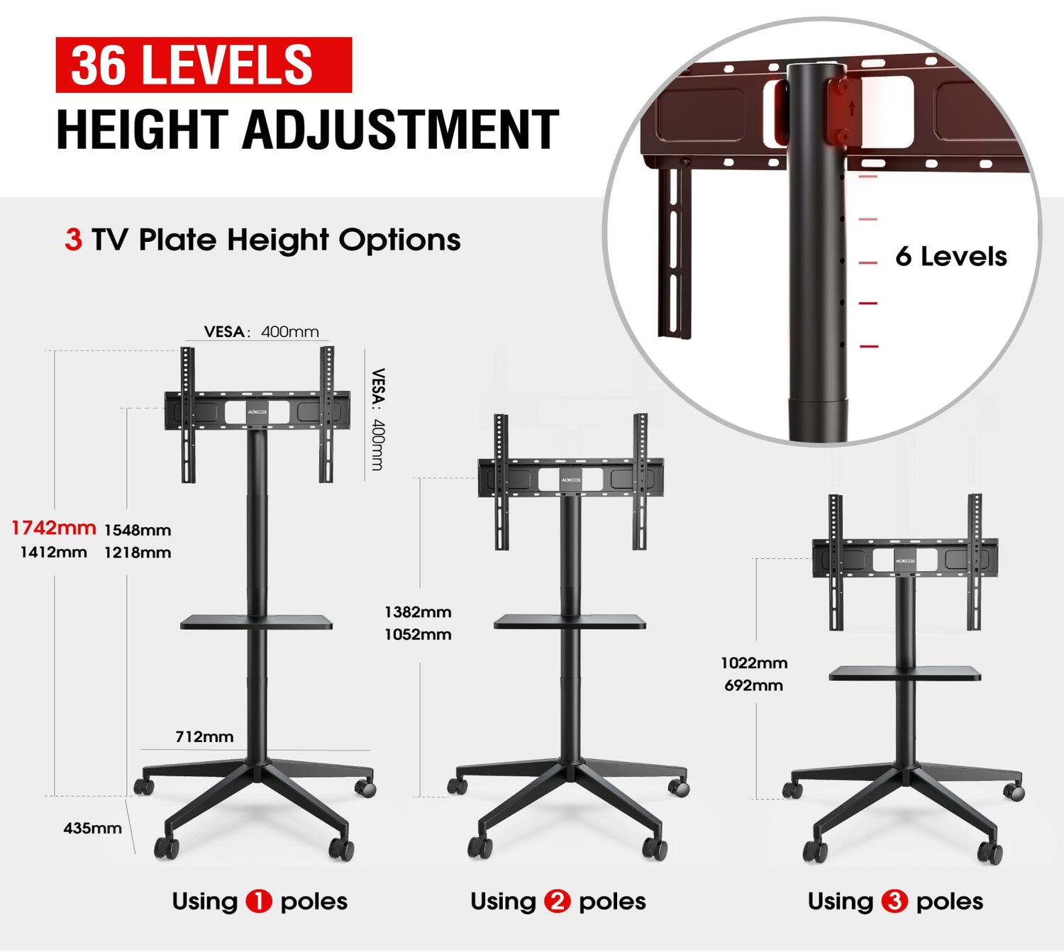 The AOKCOS TV rolling stand is 10 inches taller than other TV stands, with 36 levels of height adjustment from 27.2 inches to 65.8 inches, in addition to an adjustable tilt of -4 to 8 degrees to find a level state. Whether it's a home movie party or a workshop discussion in the workplace, we've got it covered.