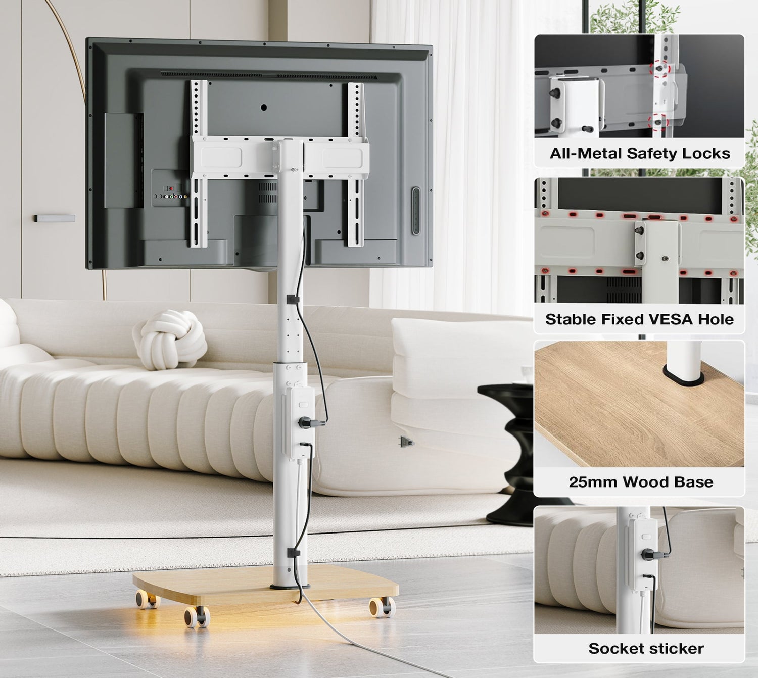 The swivel wheels roll smoothly and all wheels can be locked, which is very safe and reliable for placing the rolling TV stand in the ideal position. This is an excellent solution for raising the TV from the table without drilling holes in the wall. The cable management keeps things tidy by securing cables to the back of the center pole.