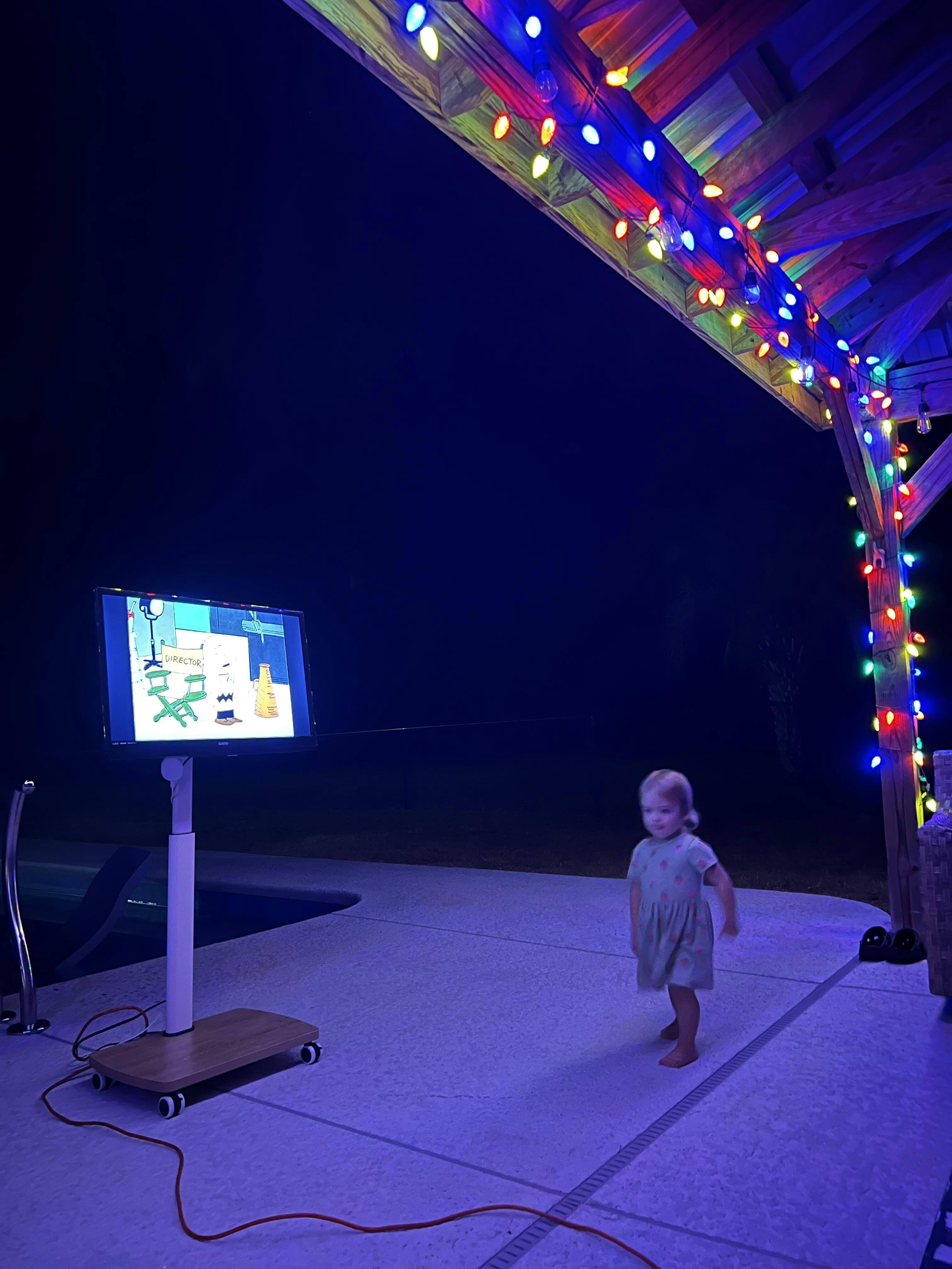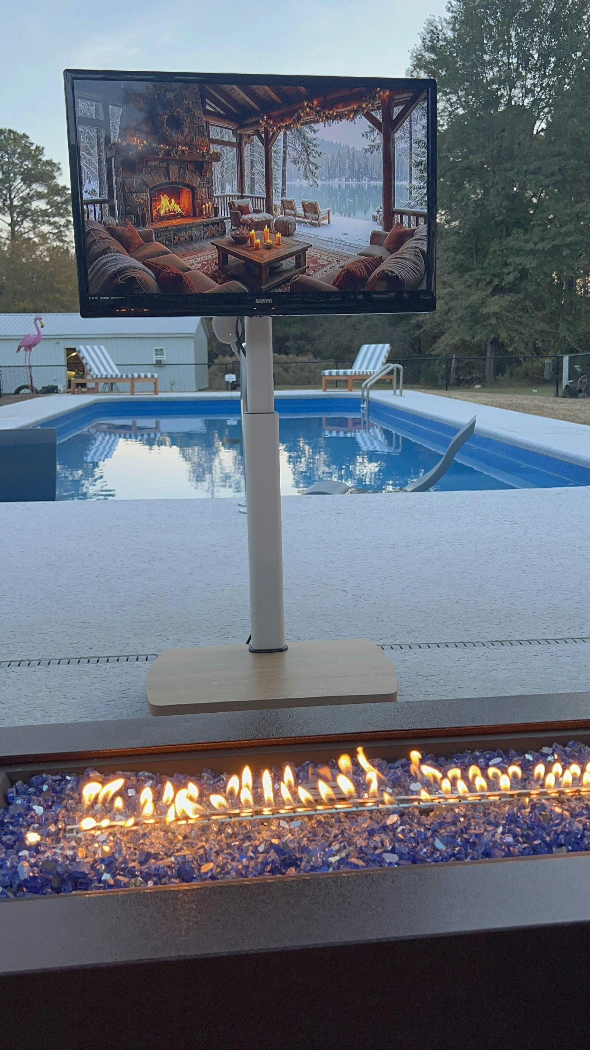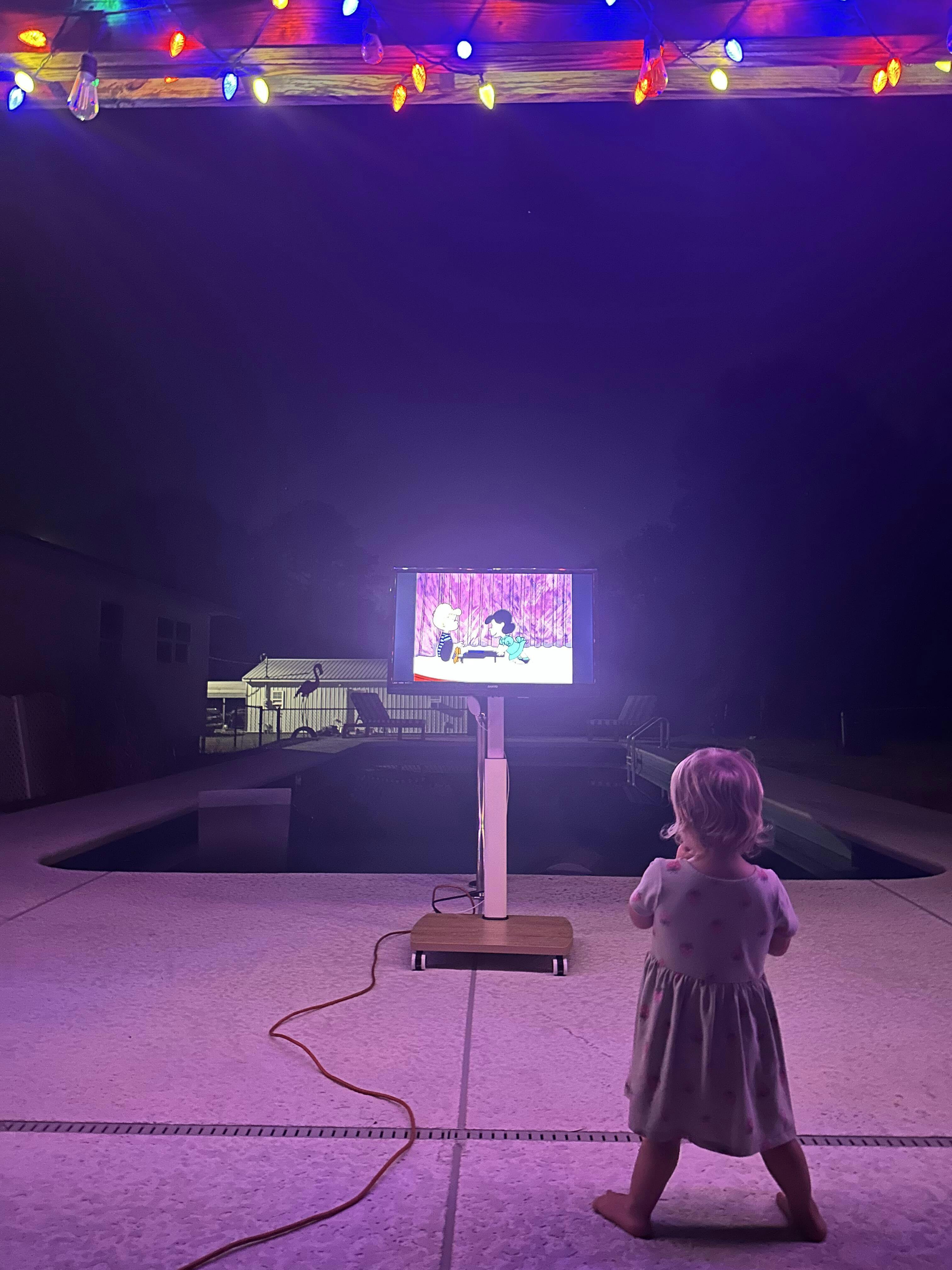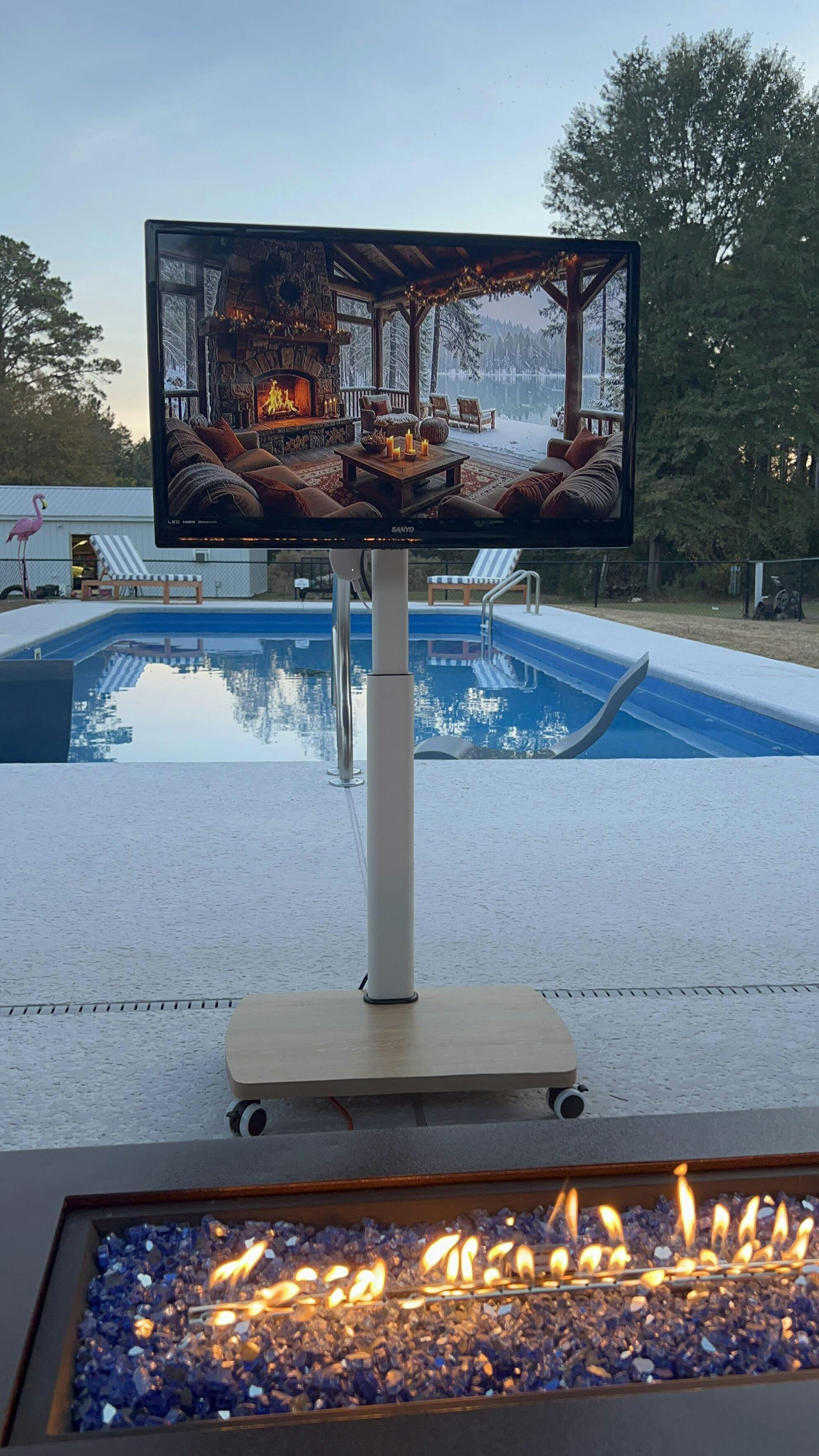 We love this rolling tv stand so much. If you have a room in your home without a tv this is perfect. You can watch tv anywhere. We are really enjoying out by the pool. We recently had a movie night outside and the grandkids loved it!! My friends who have seen ours all want one. Haha We love it! Highly recommend!